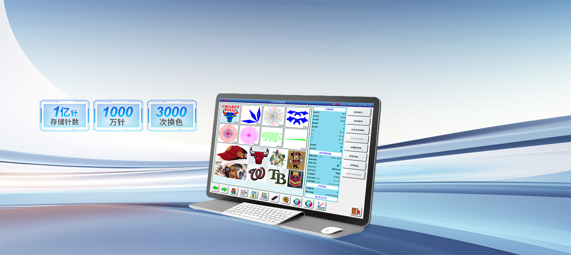 存儲針數(shù)達1億針,單個花樣可達1000萬針、3000次換色,滿足復雜花樣設計需求